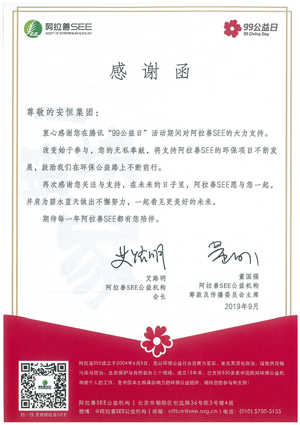 安恒集团热心社会公益事业,积极践行企业社会责任。2015年7月,安恒加入阿拉善SEE生态协会;2018年8月,成为阿拉善SEE生态协会三江源项目中心创始会员。多年来,安恒集团发起和参与了多项生态公益活动,长期支持阿拉善SEE生态保护协会三江源保护项目。